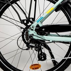 It is a robust and comfortable city model, perfect for everyday journeys. It is equipped with a suspension fork. The motor in the rear wheel provides power and a feeling of propulsion.
